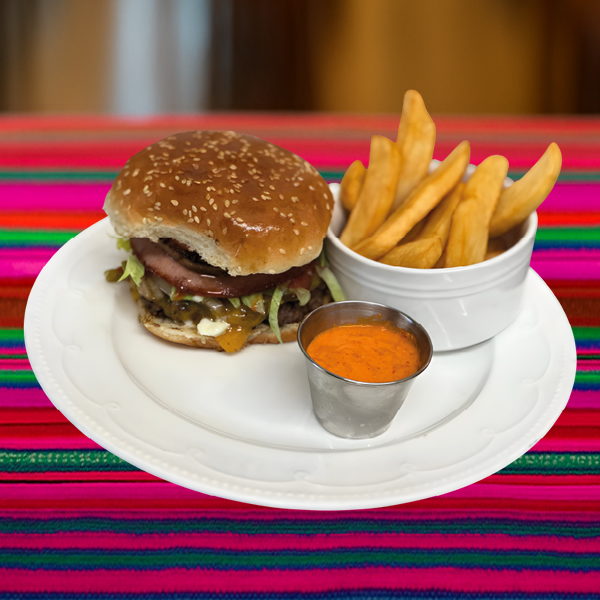 Consists of a 6 oz beef patty, sliced hot dog, a slice of ham and 1 piece of bacon. Completed with shredded lettuce, tomato, pickled jalapeƱo, grilled pineapple and grilled white onion.