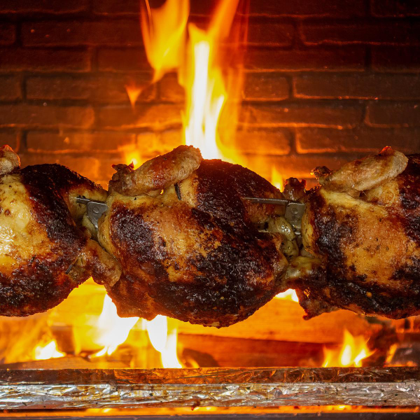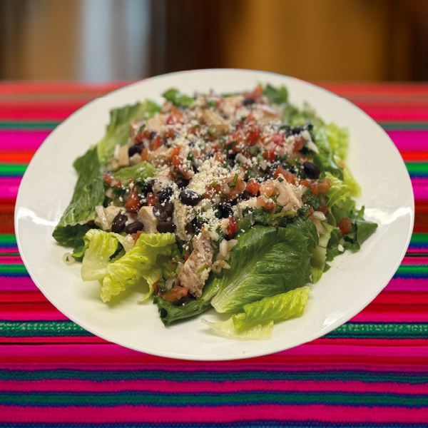 Copacabana Chicken Salad: Indulge in the delightful pairing of our charcoal chicken, served atop a bed of crisp romaine lettuce, Black whole beans and elevated by the spicy kick of pico de gallo and the creaminess of queso fresco.