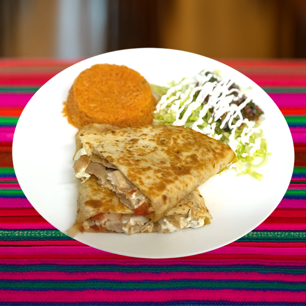 A twelve-inch flour tortilla is filled with a savory blend of steak, Oaxaca cheese, onions, and tomato, and is served with a refreshing shredded salad, pico de gallo, sour cream, and a side of yellow rice.