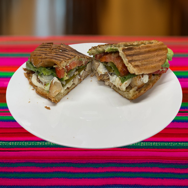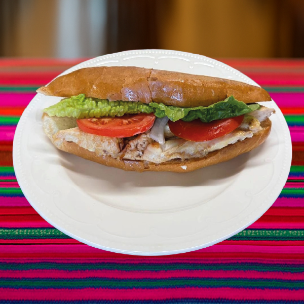 Thinly Sliced Chicken, shredded lettuce, tomato, onion (marinated in vinegar), pickled jalapeƱo, fresh avocado, Oaxaca (mexican cheese) and mayonnaise. Served on a warm fresh telera bread.