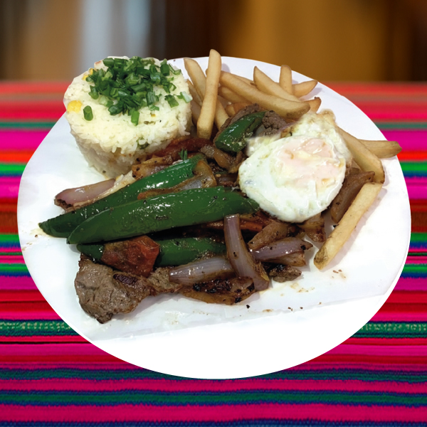 Steak, stir-fried onions, jalapeƱo peppers, and tomatoes.