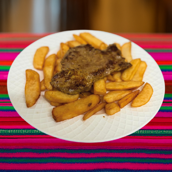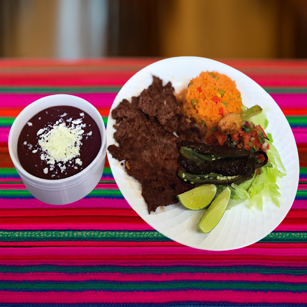 Steak Platter. Served with mexican rice, refried beans, and yellow tortillas. With a side of salad (Shredded lettuce, pico de gallo, jalapeƱo and baby onion)