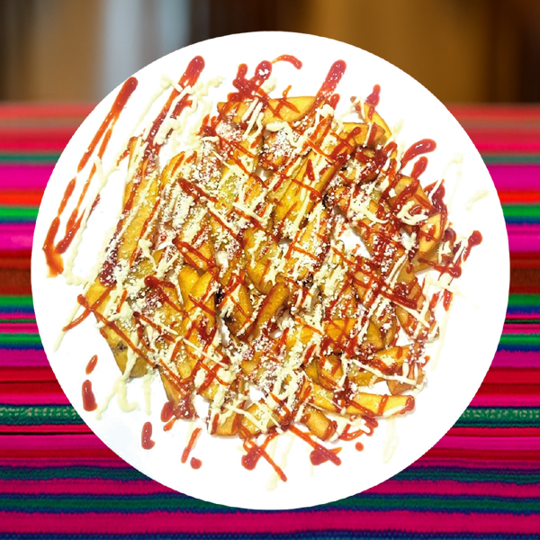Thick cut fries with ketchup, Mayonnaise and topped with queso cotija