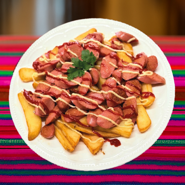 Sliced hot dog sausages, thick cut french fries and topped with ketchup, and our yellow sauce.